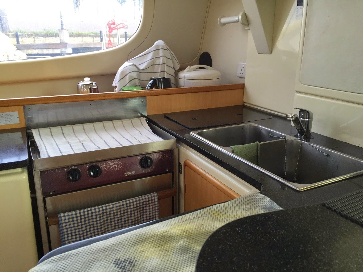 It has a double kitchen sink, stove, oven, rice cooker, electric kettle and a bar fridge. The small counter tops are good enough for some cutting and preparation of food.